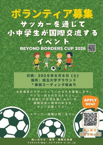 本学で、一般社団法人Seeds等との共催により「Beyond borders CUP 2026」を開催します。サッカーを通じ、小中学生が国際交流をするイベントです。(イベント詳細は、ポスター下のリンクでご確認ください)