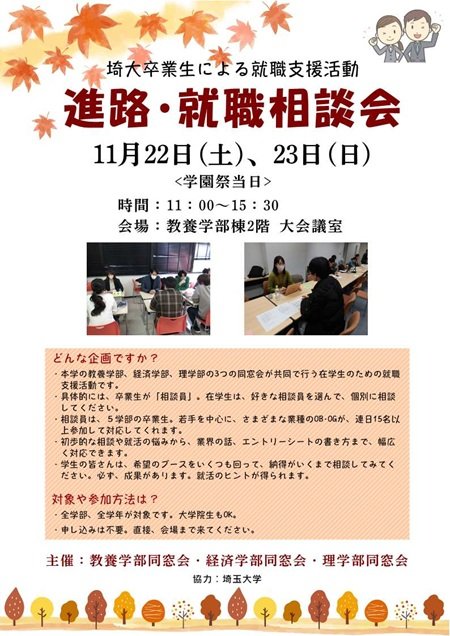 卒業生の方は、学生当時を思い出して同窓生や先輩?後輩、また、恩師との旧交をあたためていただき、在学生の方には、卒業生との交流を通じて様々なお話を聞く機会として、大学のお近くにお住まいの方々には、埼玉大学のことをより広く知っていただく日となります。