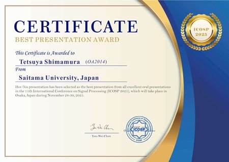 11月28日から30日にかけて大阪で開催された国際会議「International Conference on Signal Processing (ICOSP) 2025」において、大学院理工学研究科の島村徹也教授が代表発表を行った共同研究論文が Best Presentation Award を受賞しました。